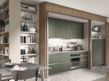 Это кухня, которую можно полностью спрятать за фасадами. Когда она закрыта — вы видите просто стену с ровными панелями, без ручек, без техники, без следов готовки. Открыли — всё внутри: плита, мойка, посудомойка, холодильник, хранение, рабочие поверхности.